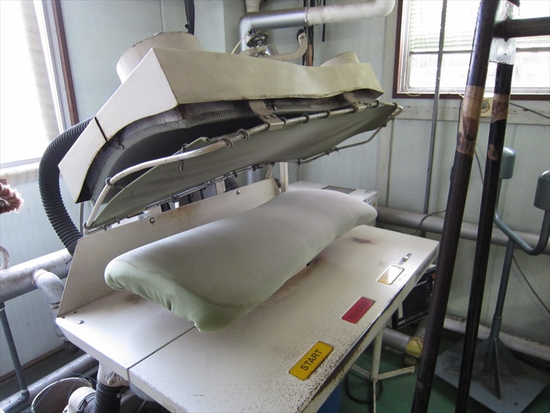 自動プレス機で学生服の中に蒸気(水分)が含まれている為、箱入れ前に蒸気を飛ばします。