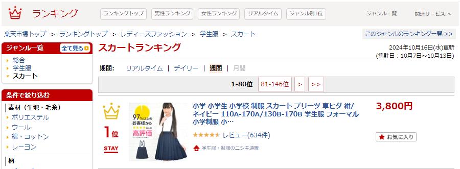 ランキングトップ > レディースファッション > 学生服 > スカート